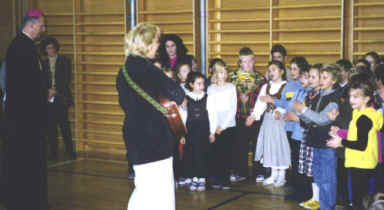 | Nach dem festlichen Empfang im Turnsaal, den der Schulchor unter der Leitung